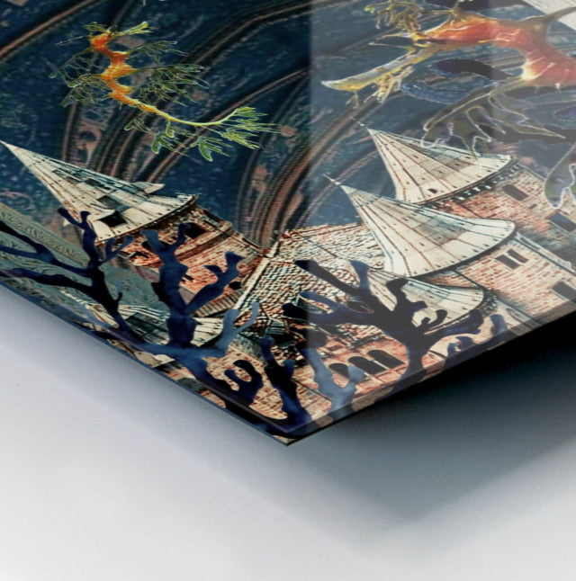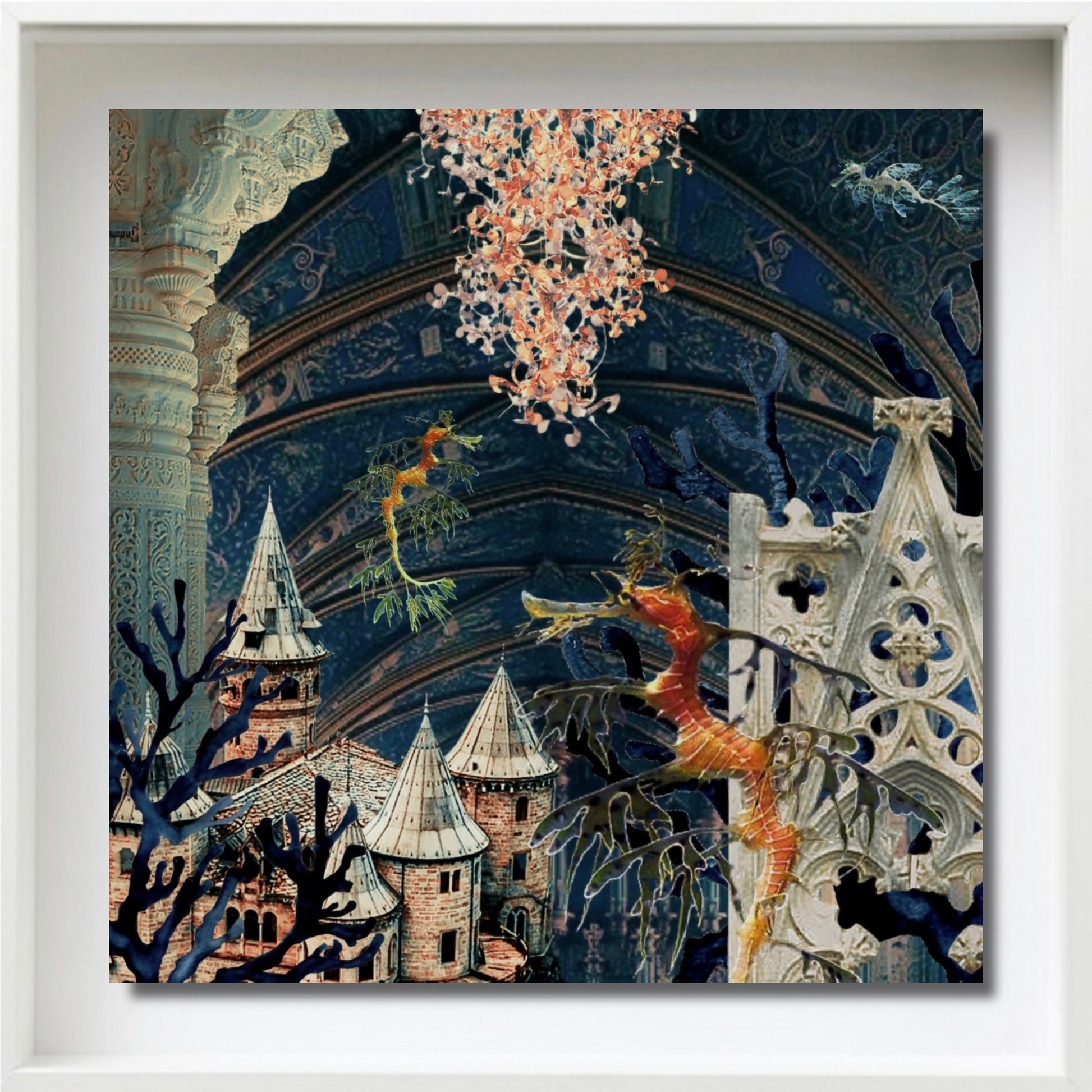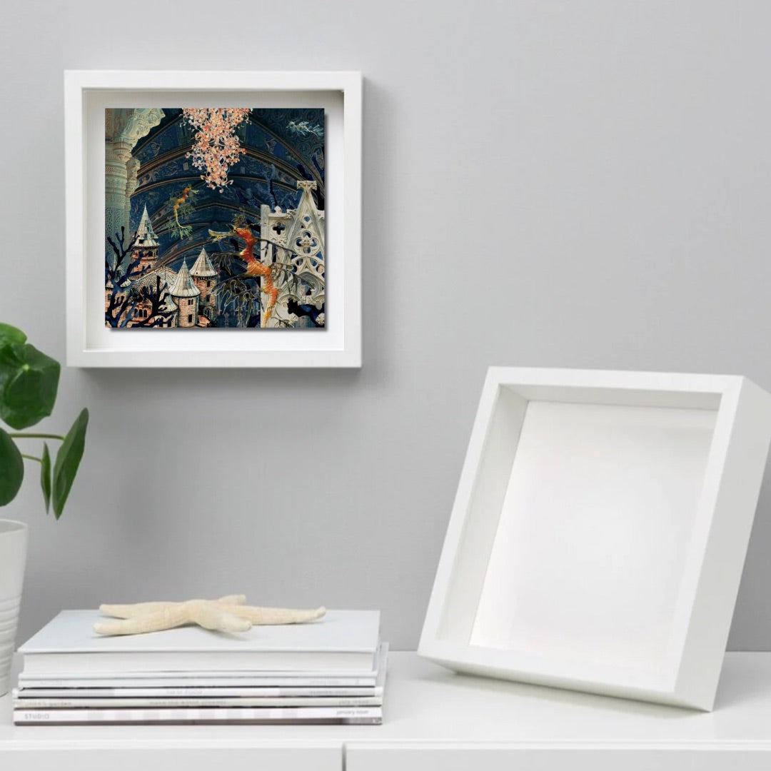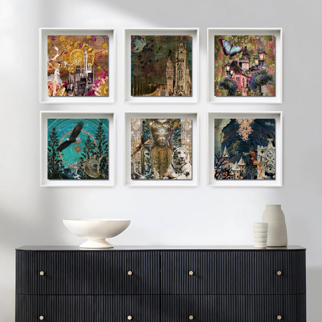 SSD Original Collage Art Printed on 8”x 8”x 1/16” Lightweight Tempered Glass Tile, Classic White Shadowbox Frame, White Acid-Free Mat Backing.