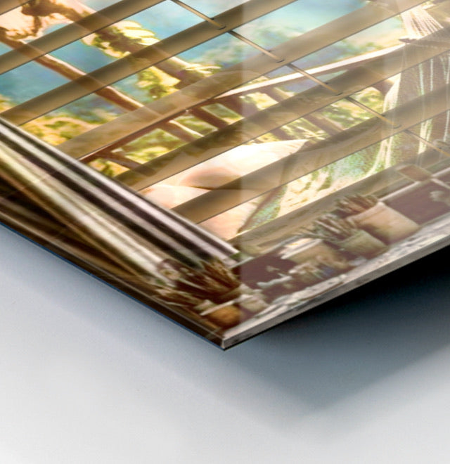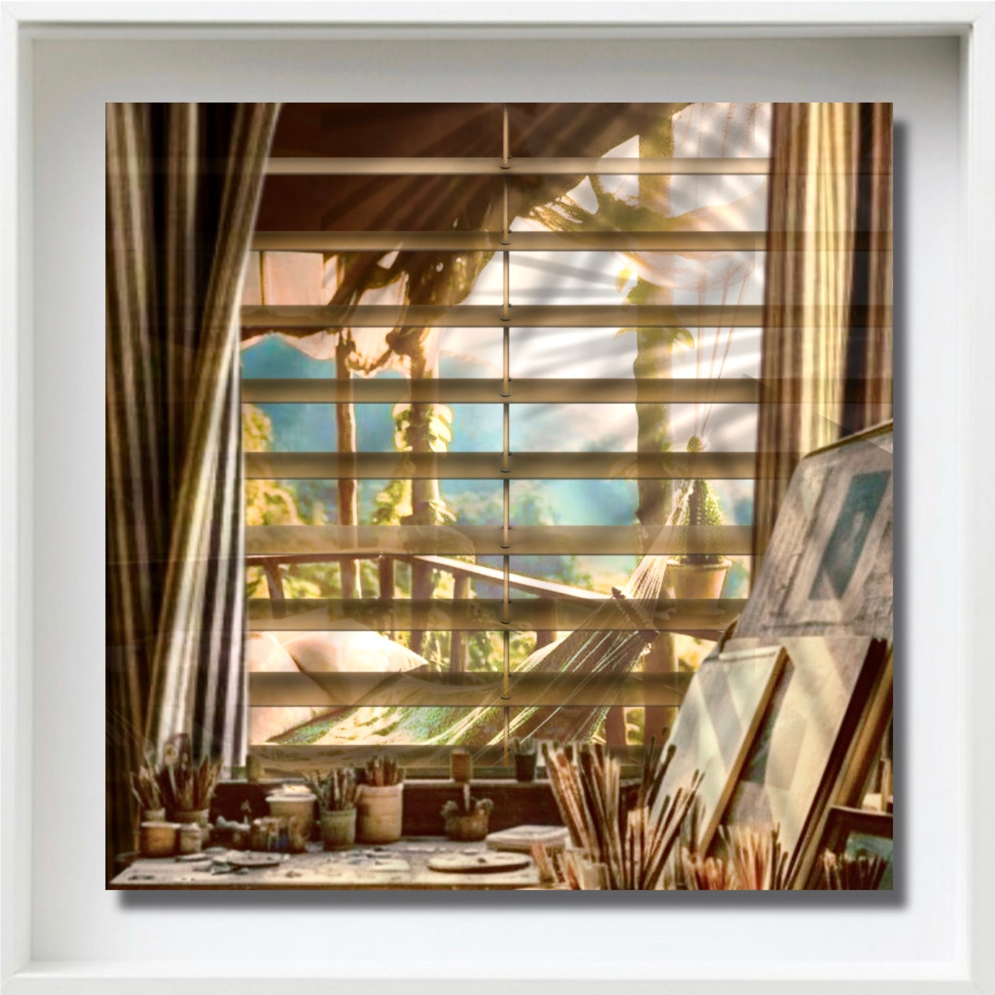 Interior View of an Artist Studio Window, Nature View Through Wood Shutters on Clear Day, Filtered Sunlight, Art Supplies, Paint Brushes, Canvas on Easel, Overlooking Veranda Patio with Inviting Hammock, Pillows.
