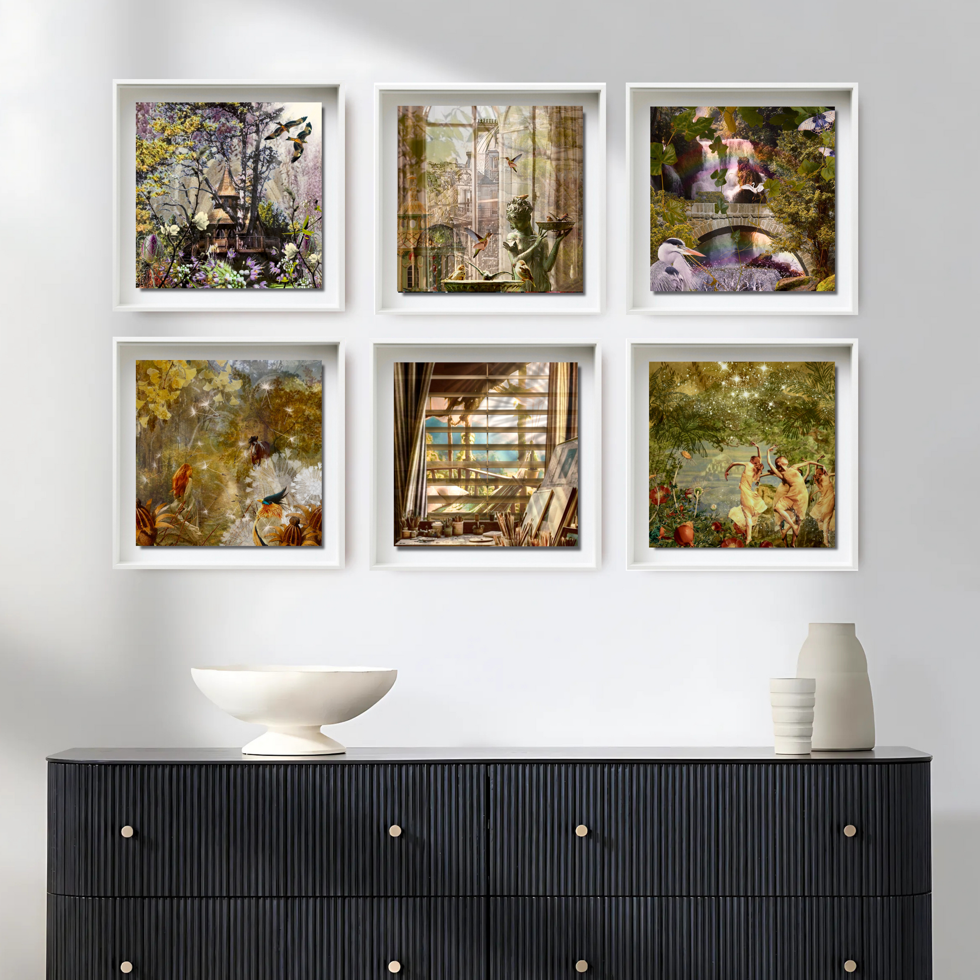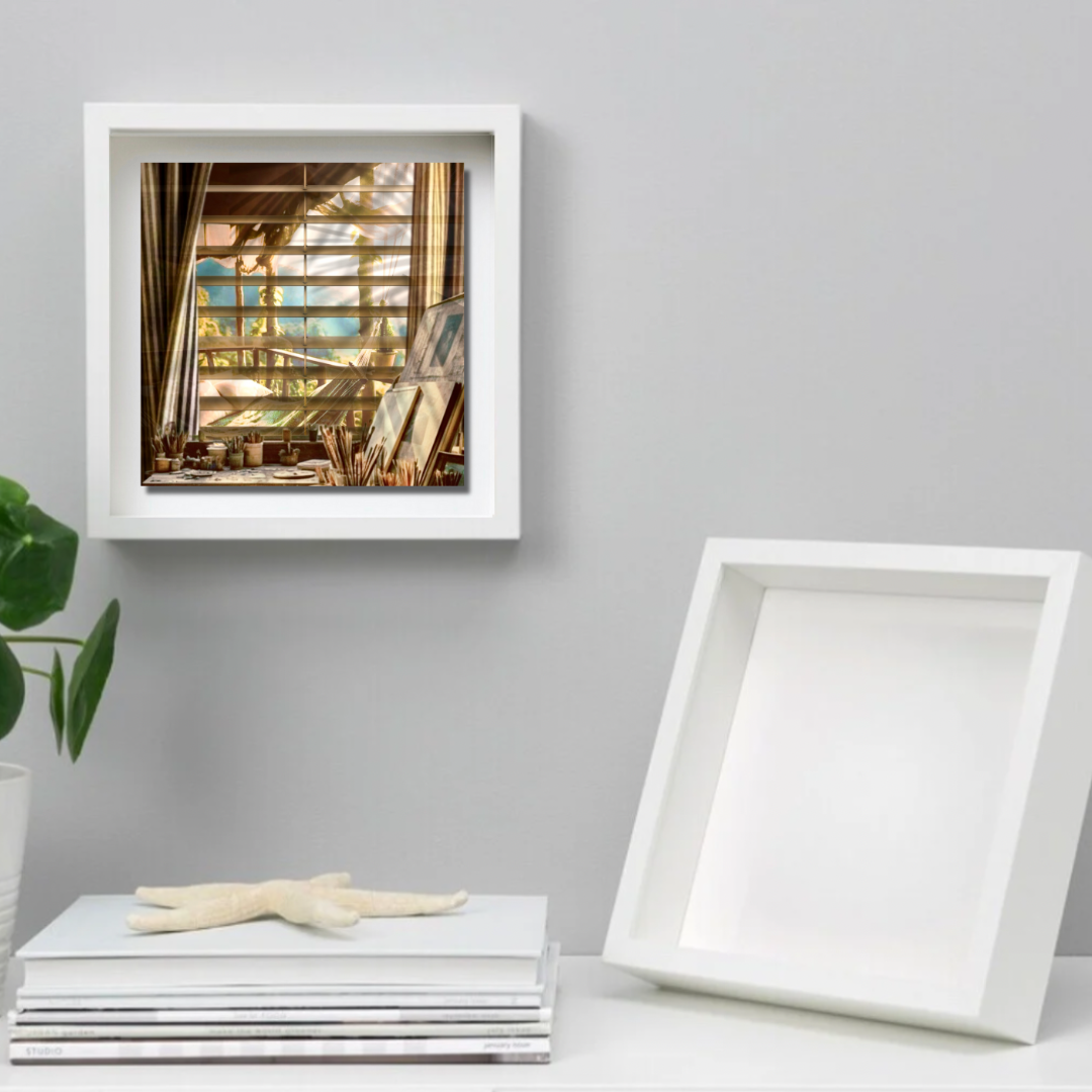 SSD Original Collage Art Printed on 8”x 8”x 1/16” Lightweight Tempered Glass Tile, Classic White Shadowbox Frame, White Acid-Free Mat Backing.