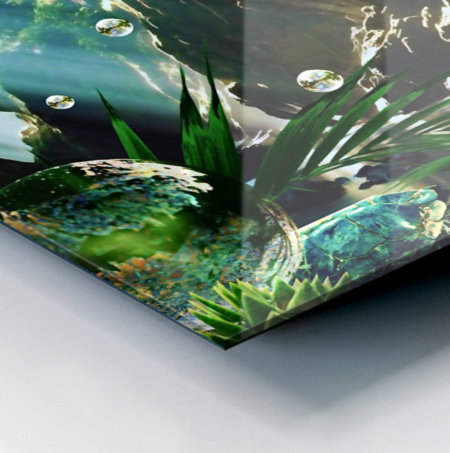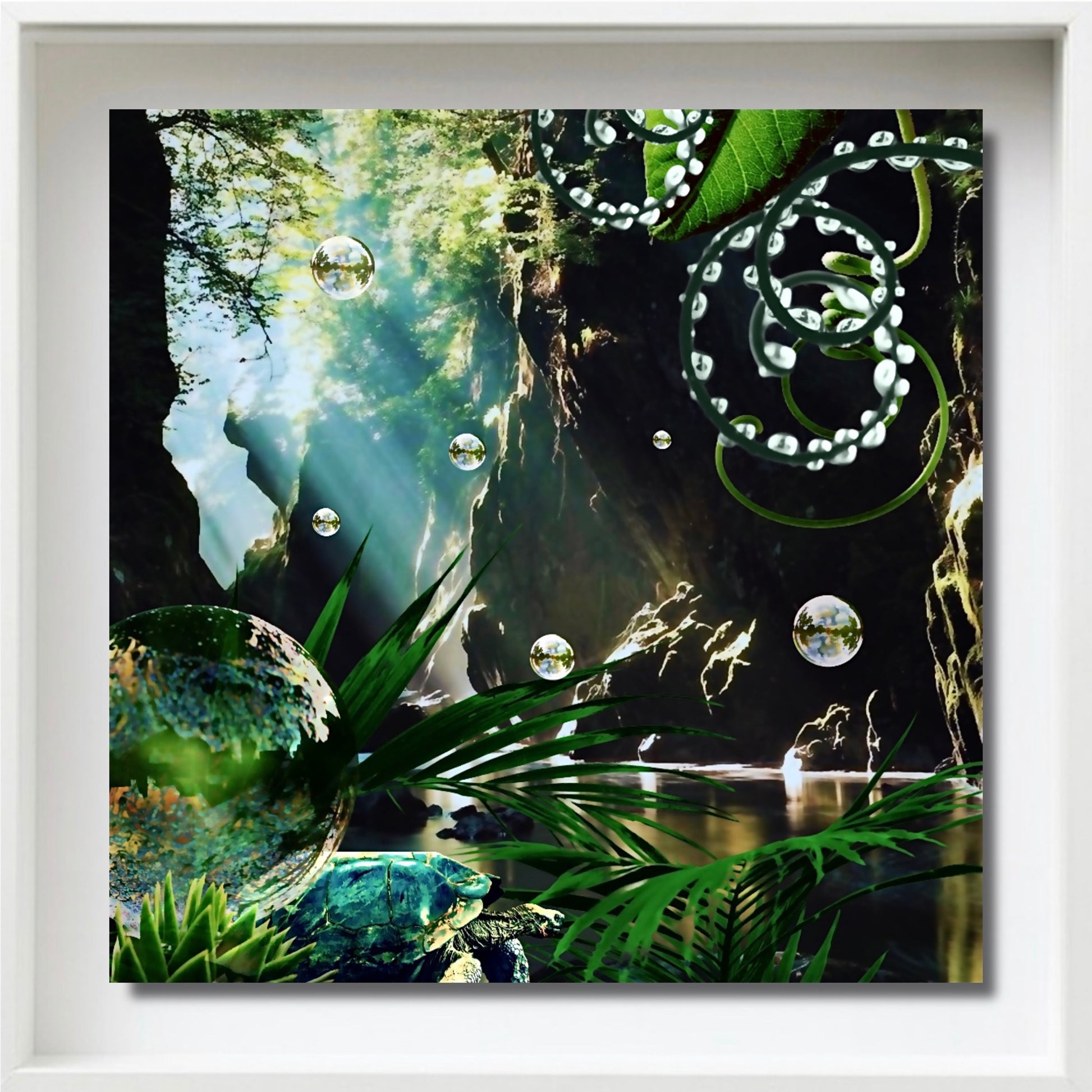 Semi-Realistic Nature Collage of a Lush Green Forest Calm Lake Scene, Bright Rays of Sunlight Filter Through Trees, Water Droplets, Bubbles in the Air and Dew Drops on Whimsical Swirls Add Whimsy to View.