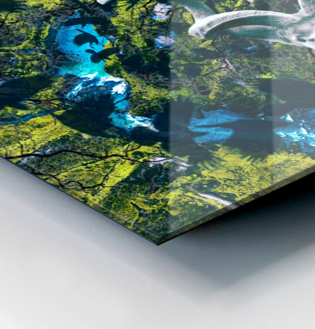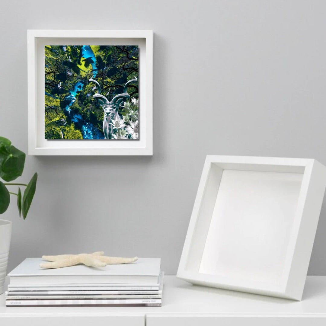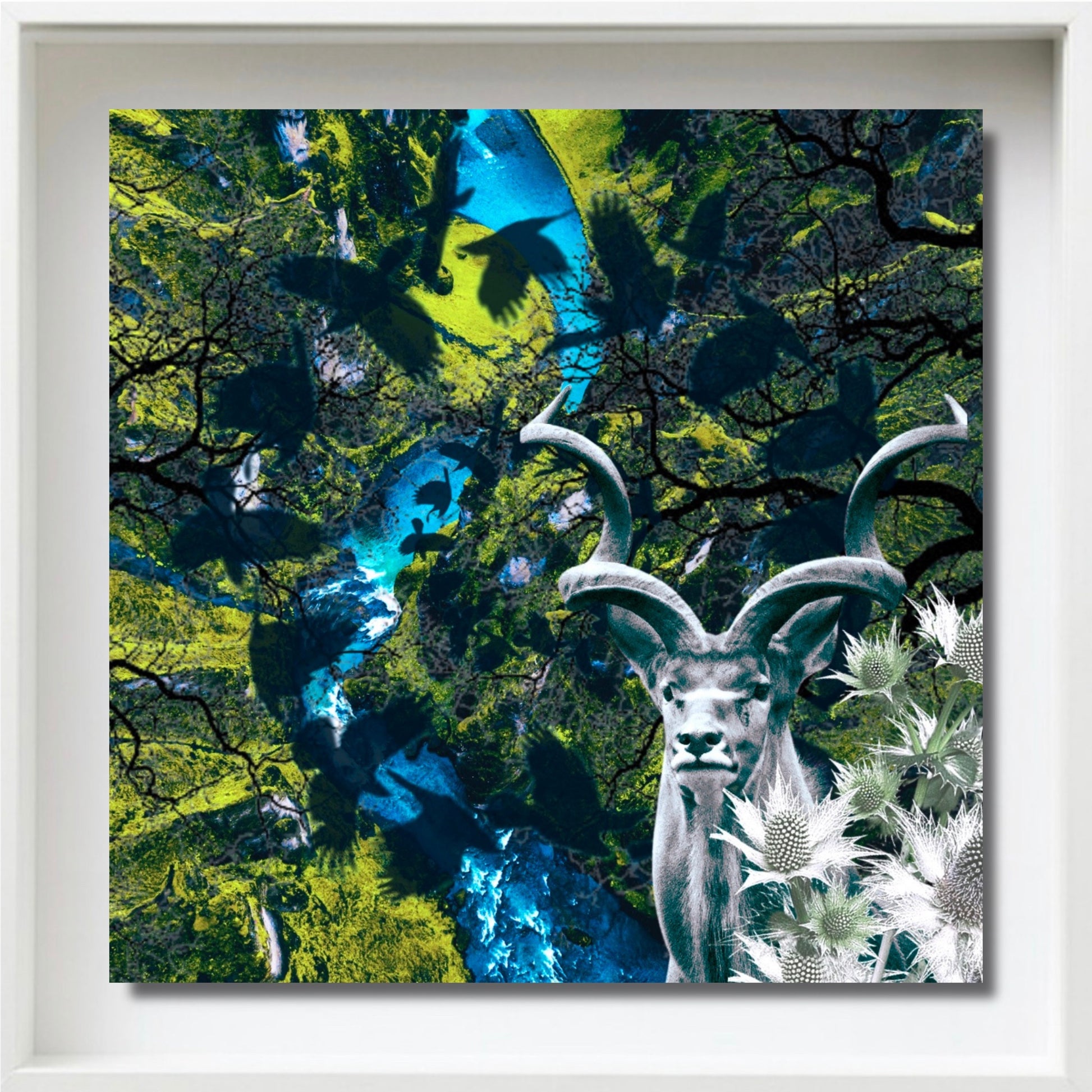 Semi-Realistic Aerial Forested River View Collage of Lush Green Trees With Central Meandering Bright Blue River, Shadows of Circling Flock of Birds Overhead, Sculptural Thistle Bush Frames Majestic Spiral Horned Antelope and Scene Beyond.