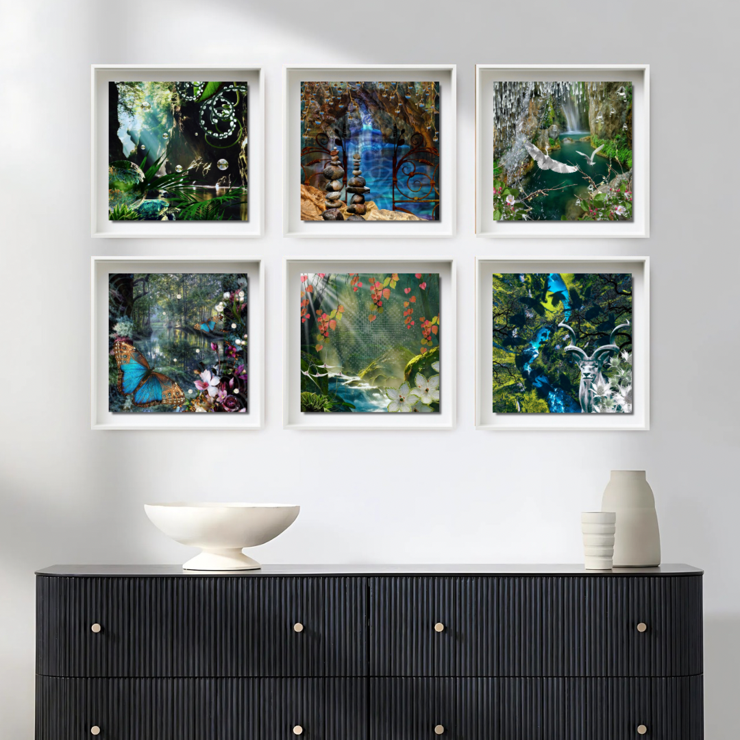 “Downstream” is featured in the Deep Calm Collection, a selection of (6) complimentary artworks by Susan Slade. Titles (L to R): #deepcalm, #livingwater, #clearwater, #aflutter, #awesomewonder, #downstream.