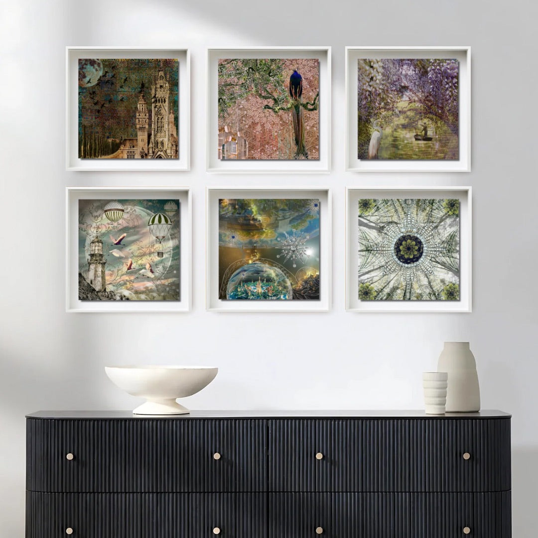 "Impressions” is featured with the Arazzo Collection, a selection of (6) complimentary artworks by Susan Slade. Titles (L to R): #arazzo, #quiescence, #impressions, #belvedere, #asabovesobelow, #wintergreen.