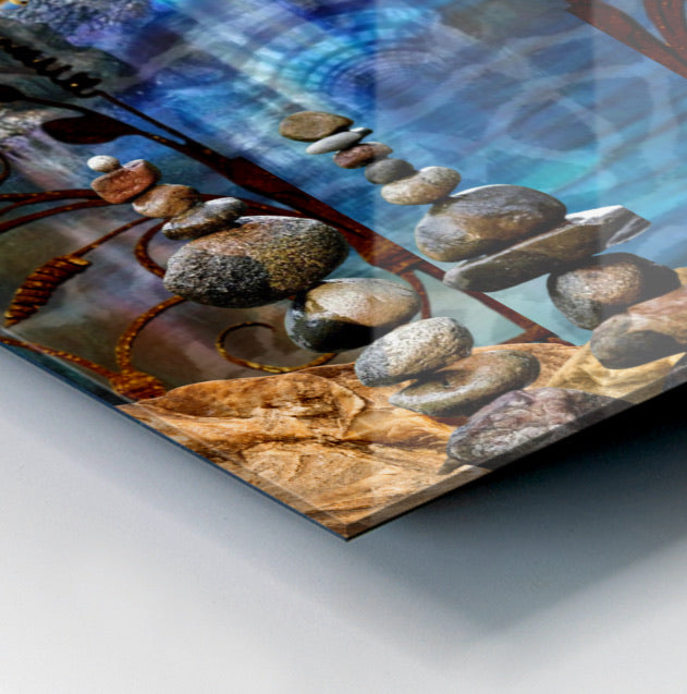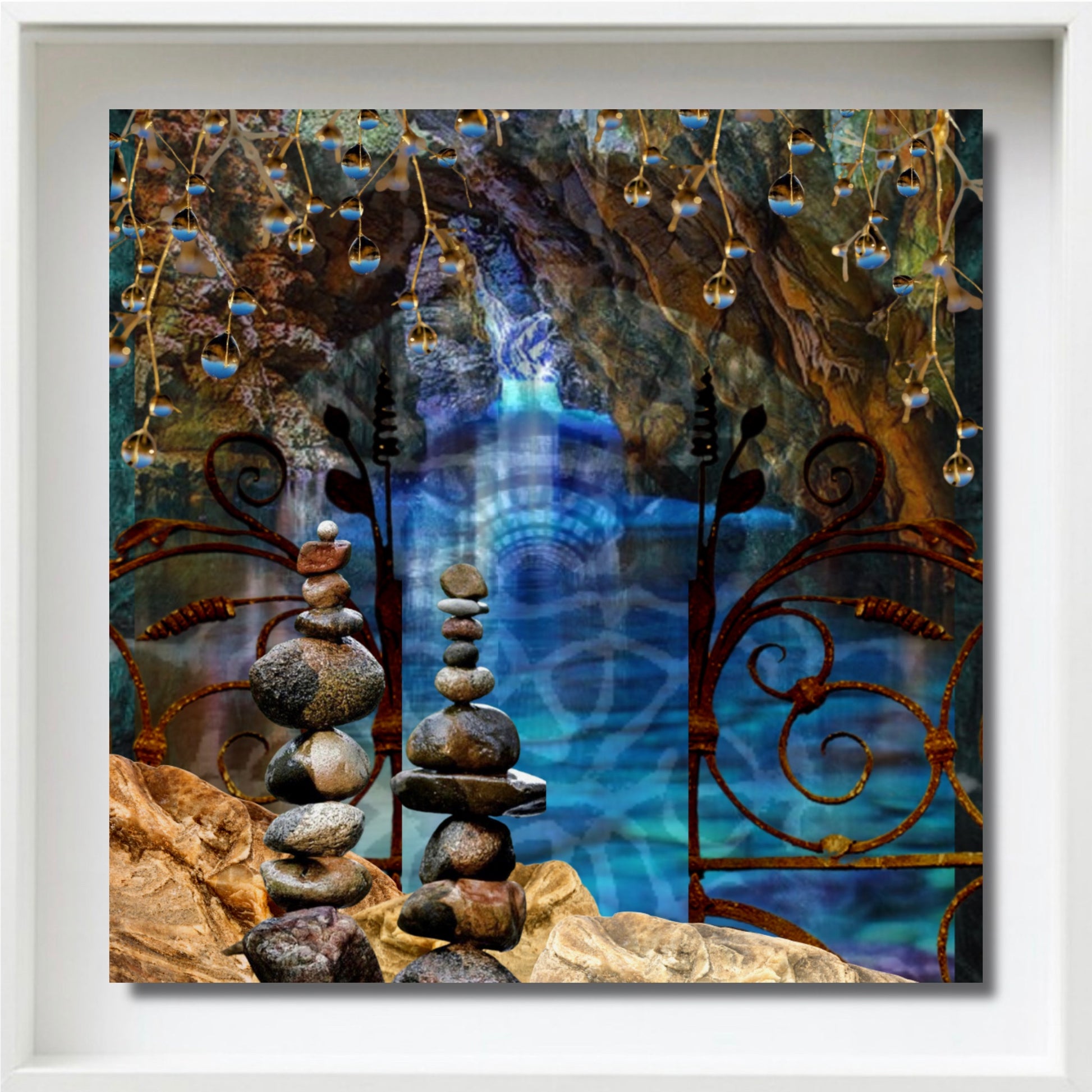 Semi-Realistic Collage of a Calm Water Pool in Cave Setting, Bright Clean Blues Cymatic Healing Frequency Pattern Backdrop, Dew Droplets Dangle from Above on Golden Strands, Stacked Meditation Rocks Rest on Natural Stone Shore and an Inviting Iron Gate Toward Pond and Beyond.