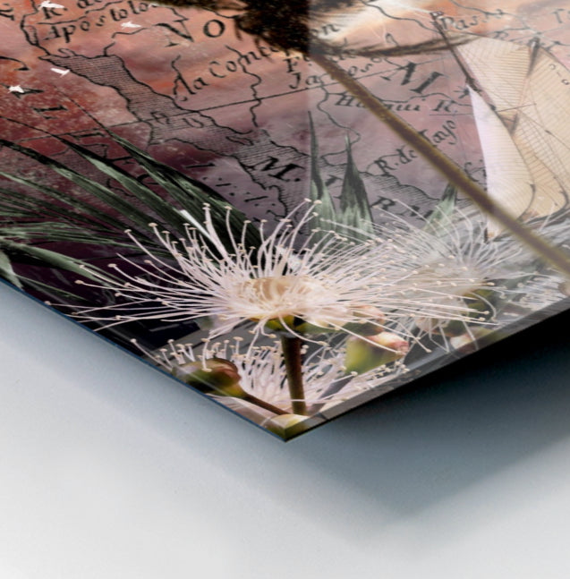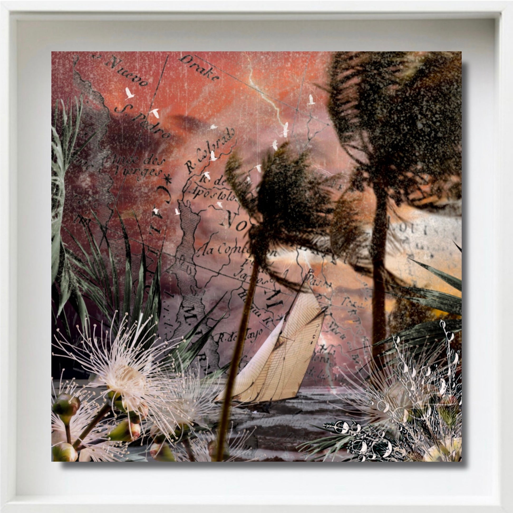 Surreal Adventure Dreamlike Blustery Ocean View of Sailboat in Waves Stormy Sea, Palm Trees, Gumnut Blossoms. Sunset Sky Old World Tartaria Map Charting Course