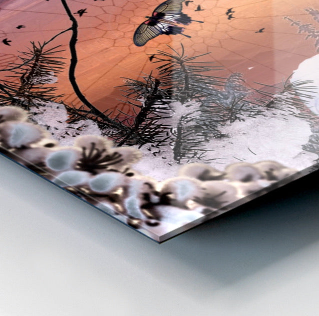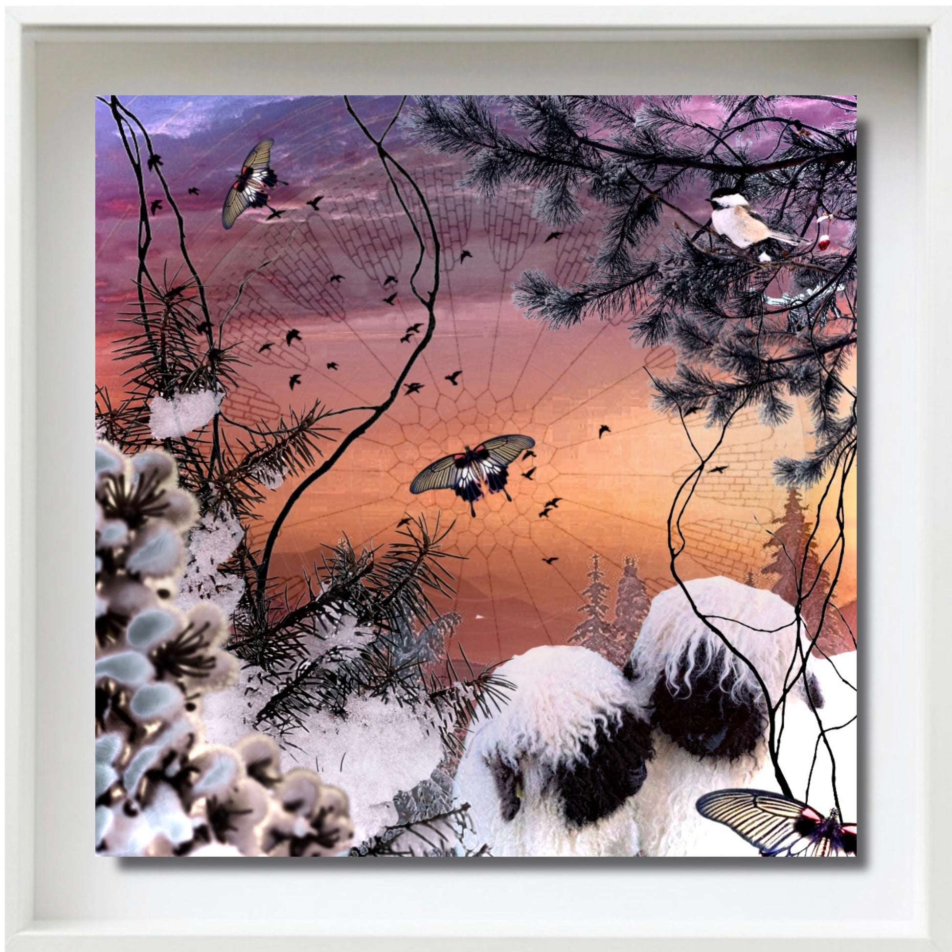 Surreal Peaceful Winter Scene Collage Orange Pink Purple Sunrise Sky View as Birds Scatter Beyond Pine Trees, Branches Fresh Fluffy Snow, Pussy Willow Foreground, Delicate Butterflies Compliment Pair of Whimsical Swiss Valais Blacknose Sheep.