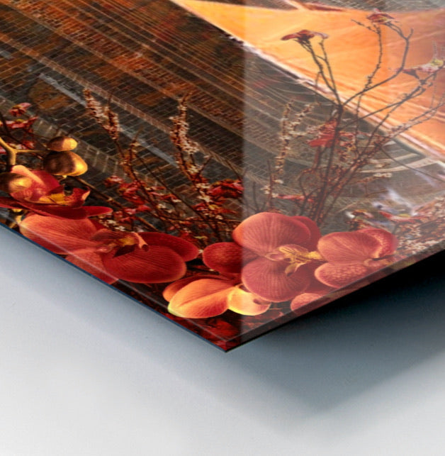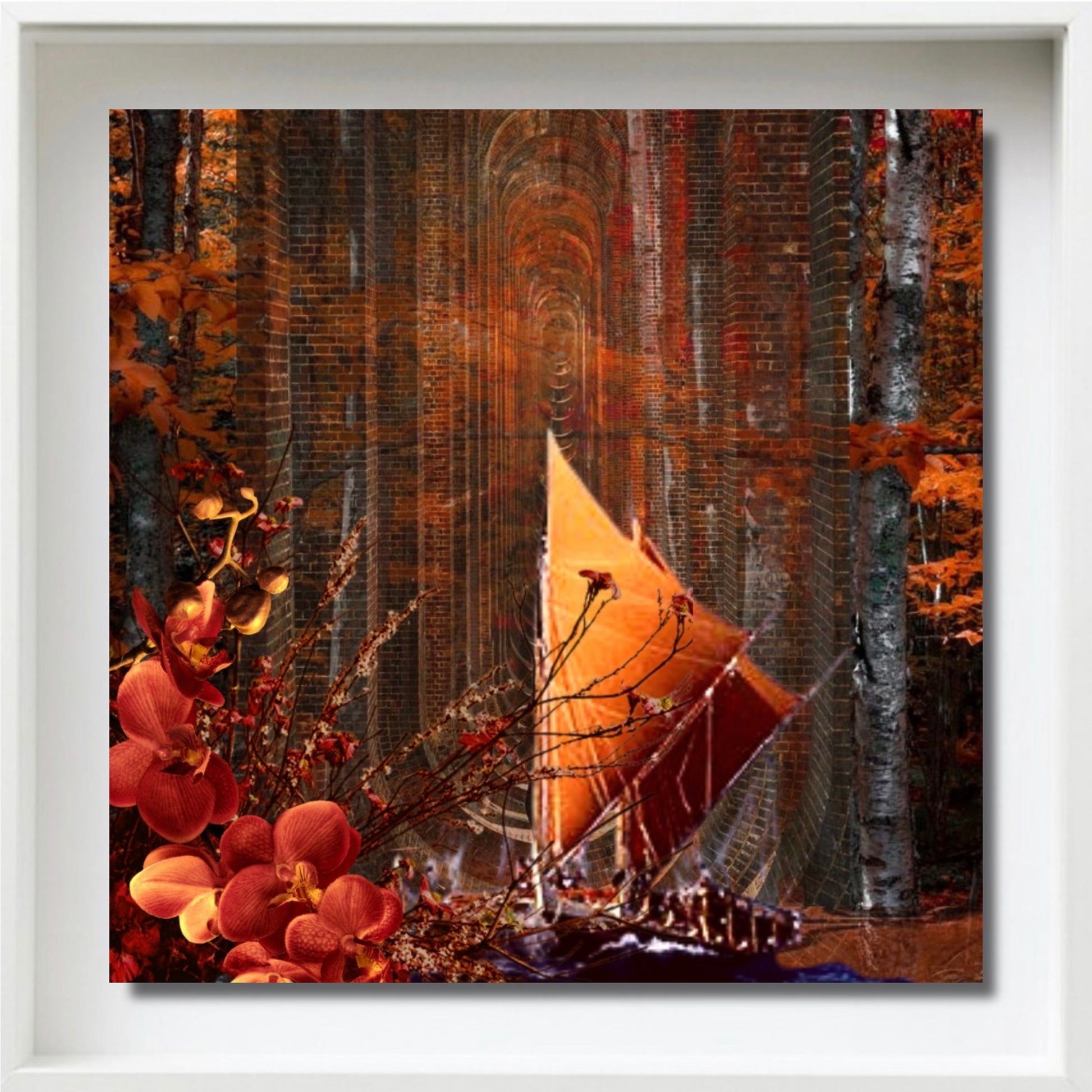 Dynamic Red Palette Of Abstract Portal of Old Stone Tunnel in Distance. Old World Ship of Sails on Adventure Journey. Exotic Red Orchids Provide Framed Point of View.